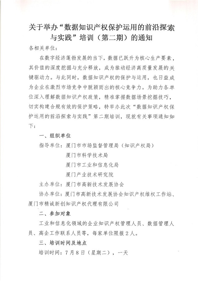 关于举办“数据知识产权保护运用的前沿探索与实践”培训(第二期)的通知